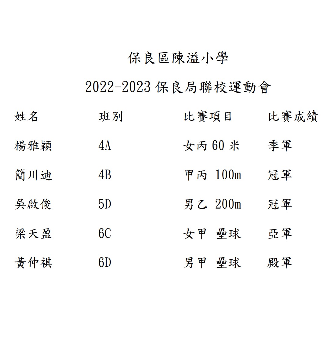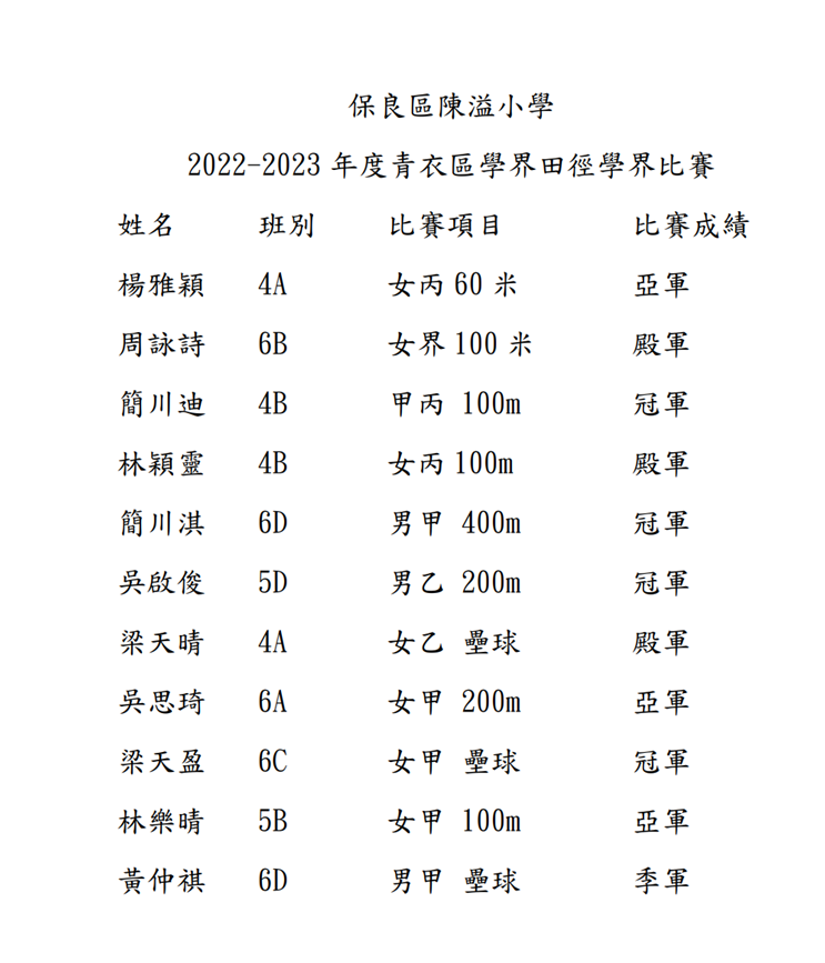 4C 林錦威 5D 朱晉皓 6B 丁子峻 6D 簡川淇 6D李東爵 6D黃茽祺