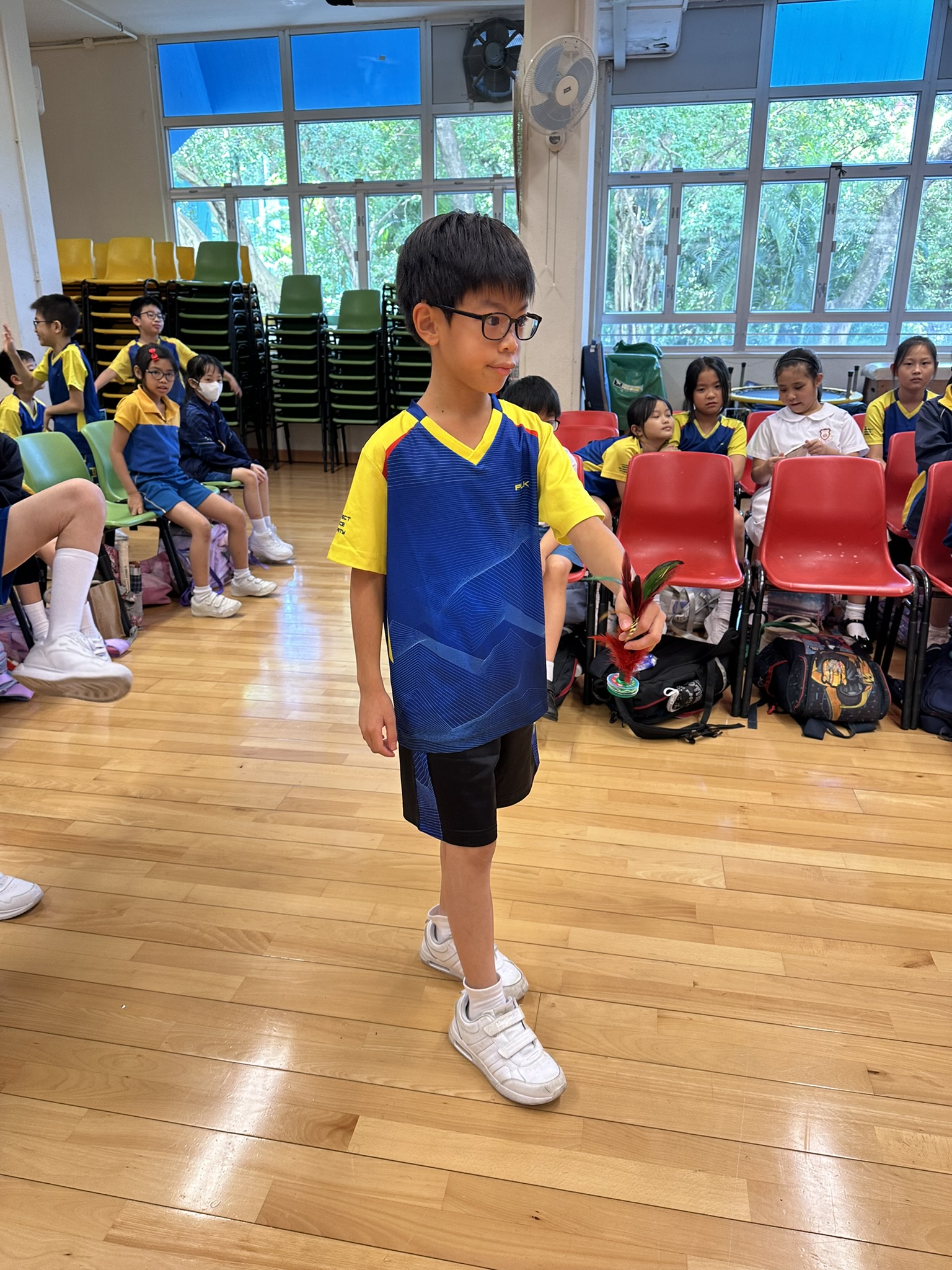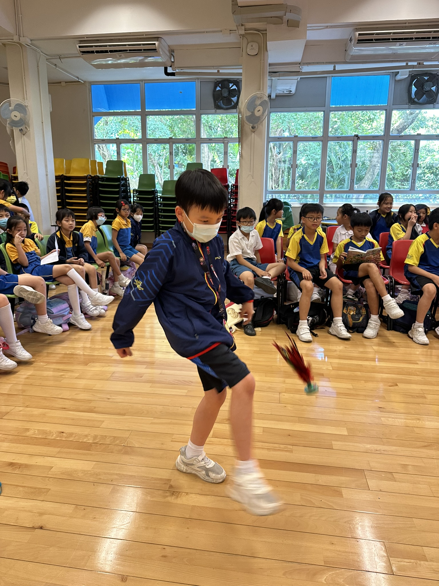四年級學生嘗試玩中國傳統遊戲——毽子,難度較高,但學生很感興趣,亦盡力嘗試。