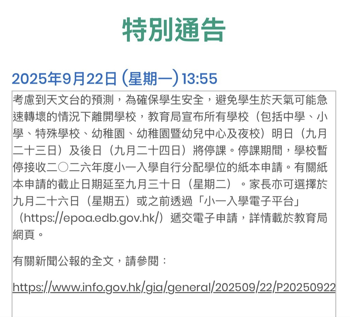 由於24/9停課,有關「如何協助子女迎接小一的挑戰(一)」家長講座將延至29/9(星期一)下午1:30-3:00活動室進行,請有興趣參加的家長準時出席。